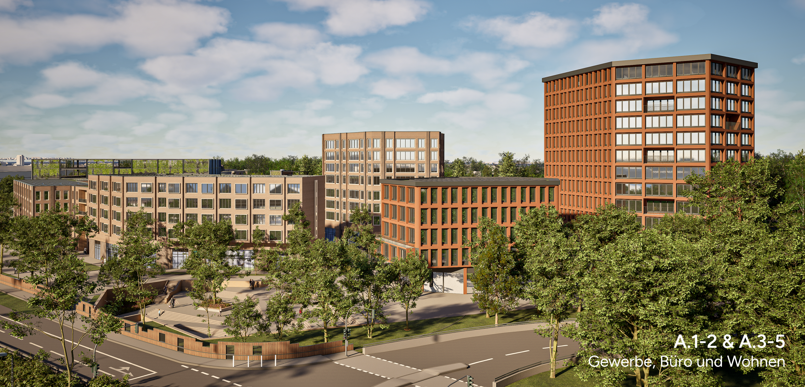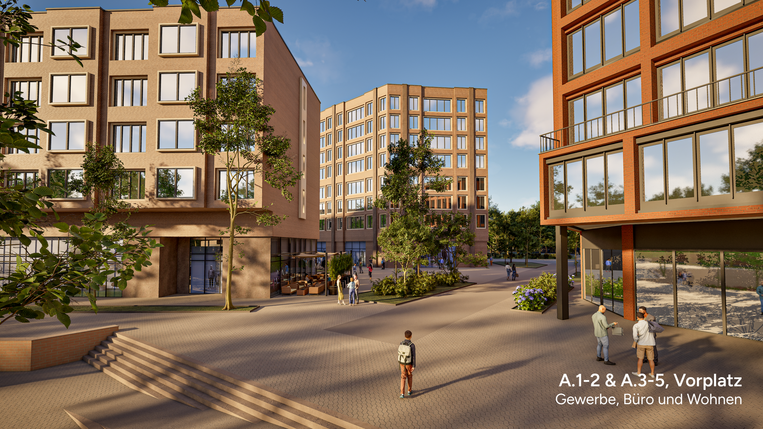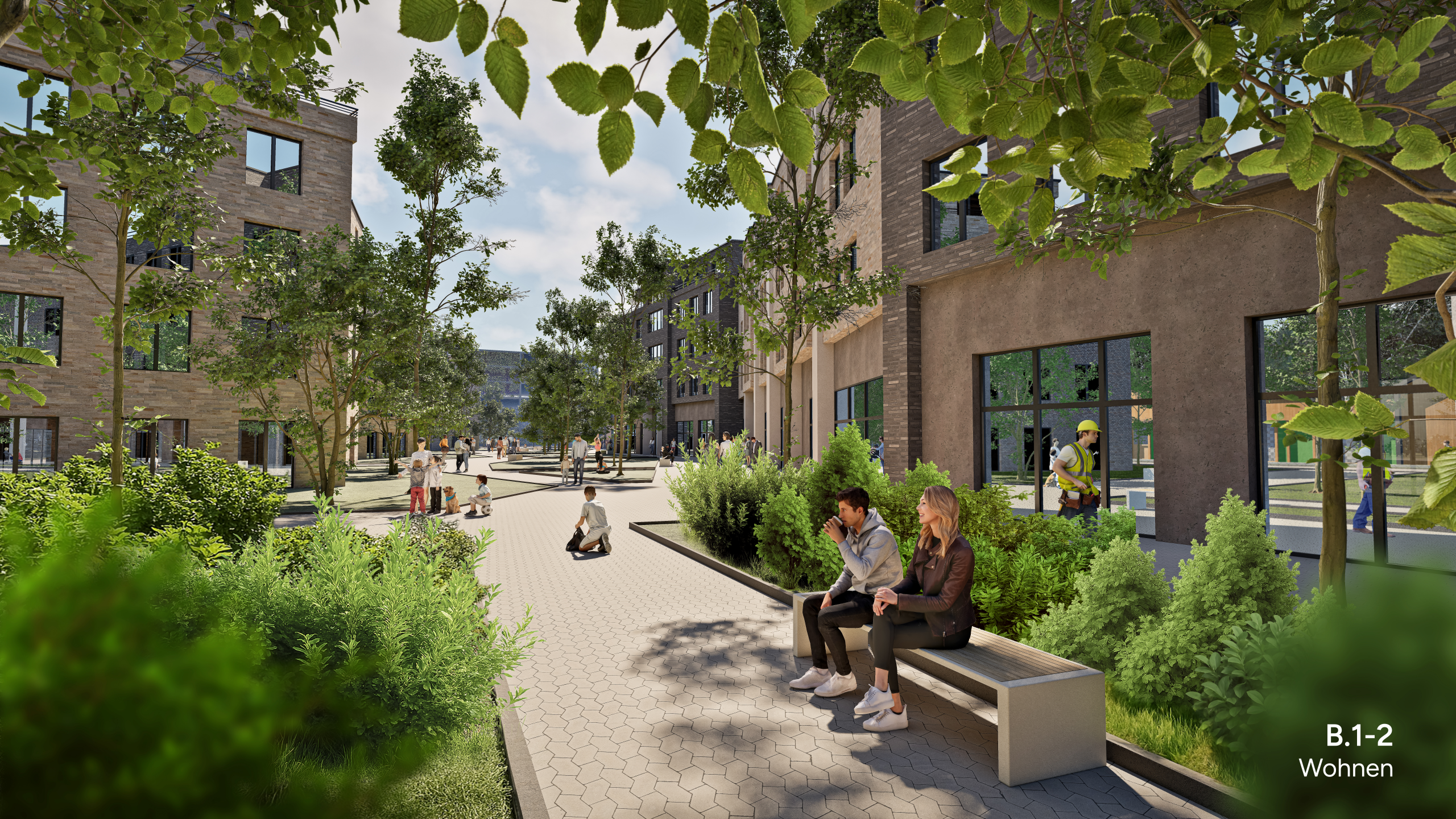 Im Quar­tier selbst ent­steht ein leben­di­ger Ver­sor­gungs­be­reichEin­kaufs­mög­lich­kei­ten für den täg­li­chen Bedarf sind in maxi­mal fünf Geh­mi­nu­ten erreichbar.