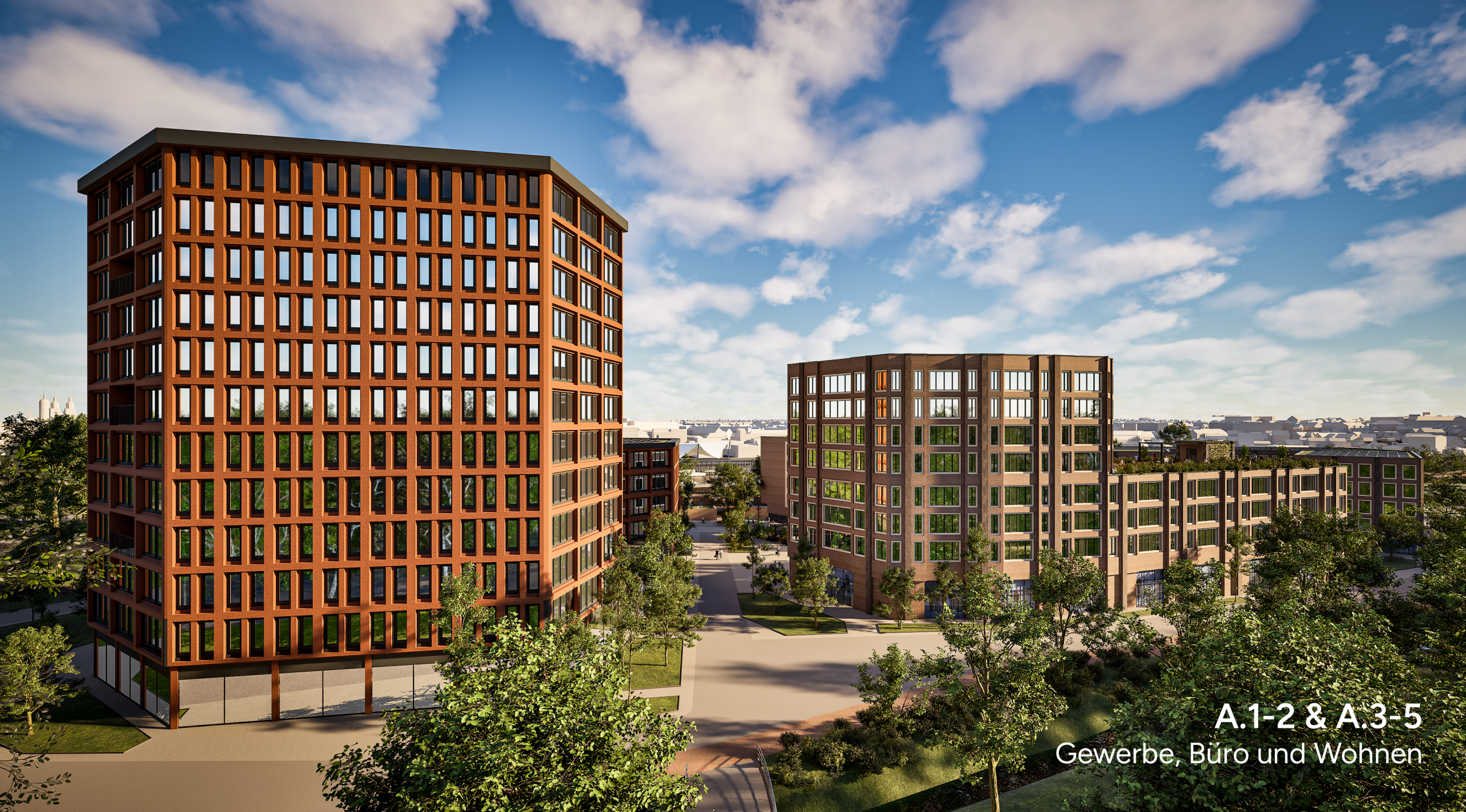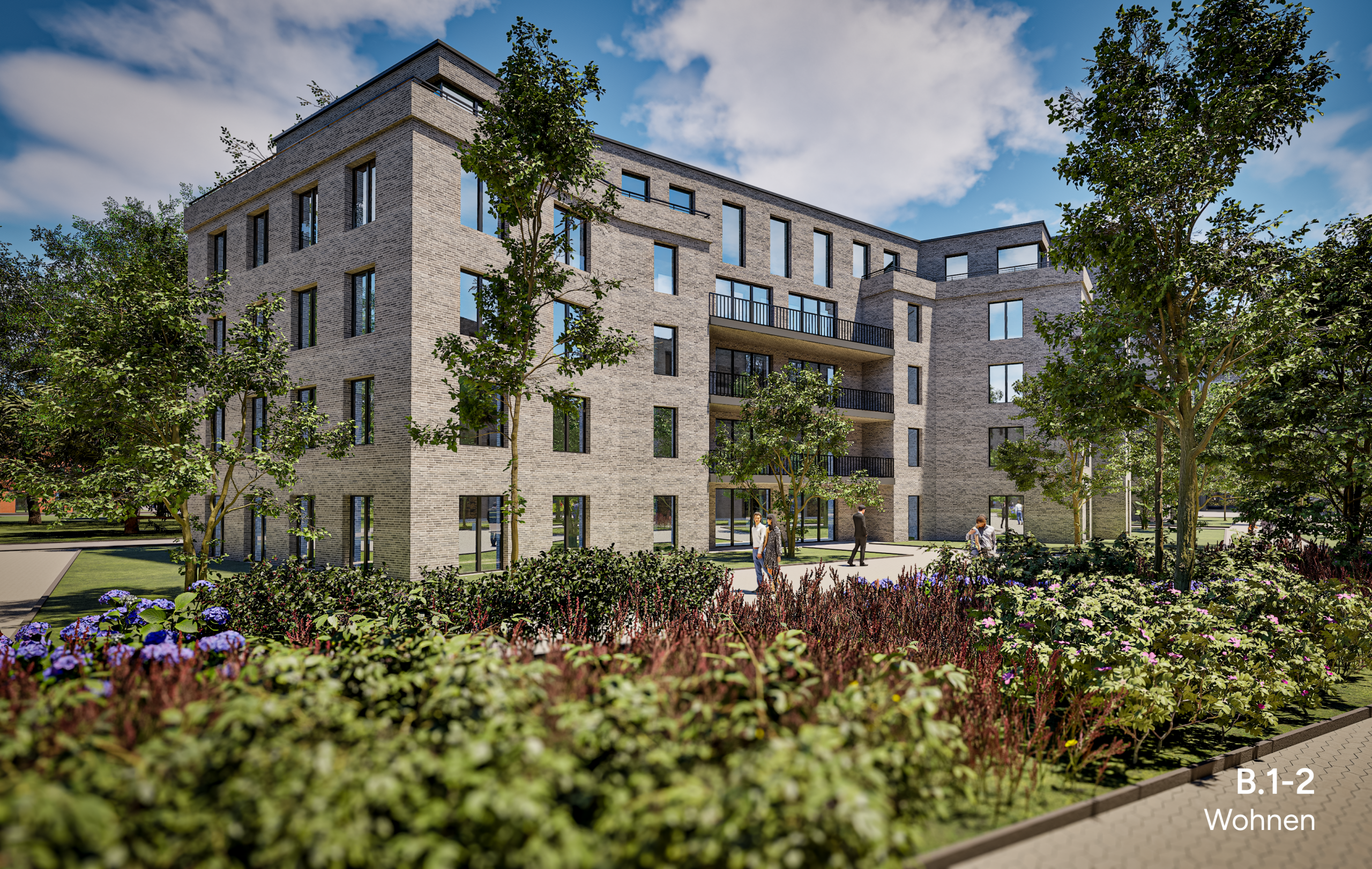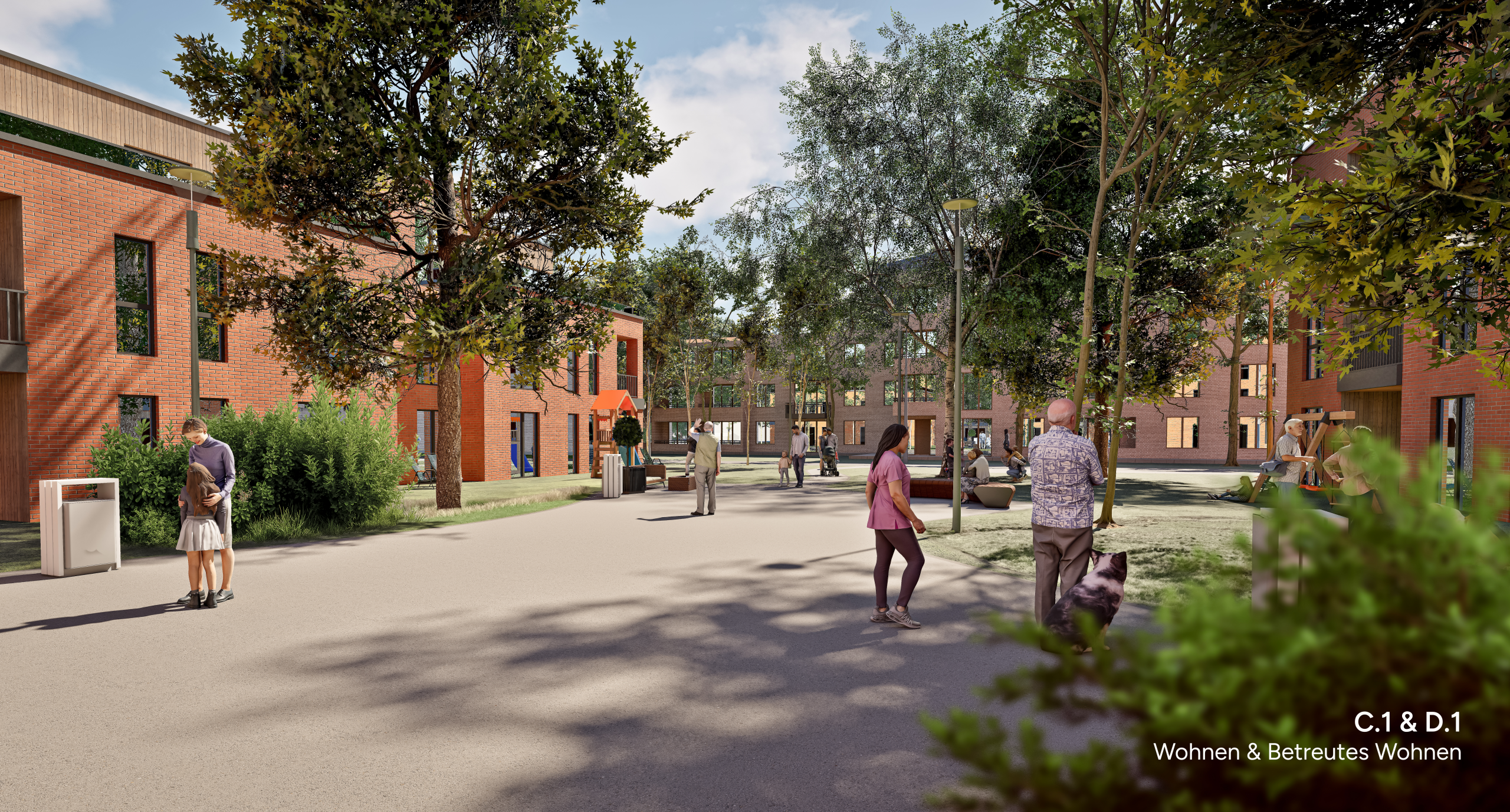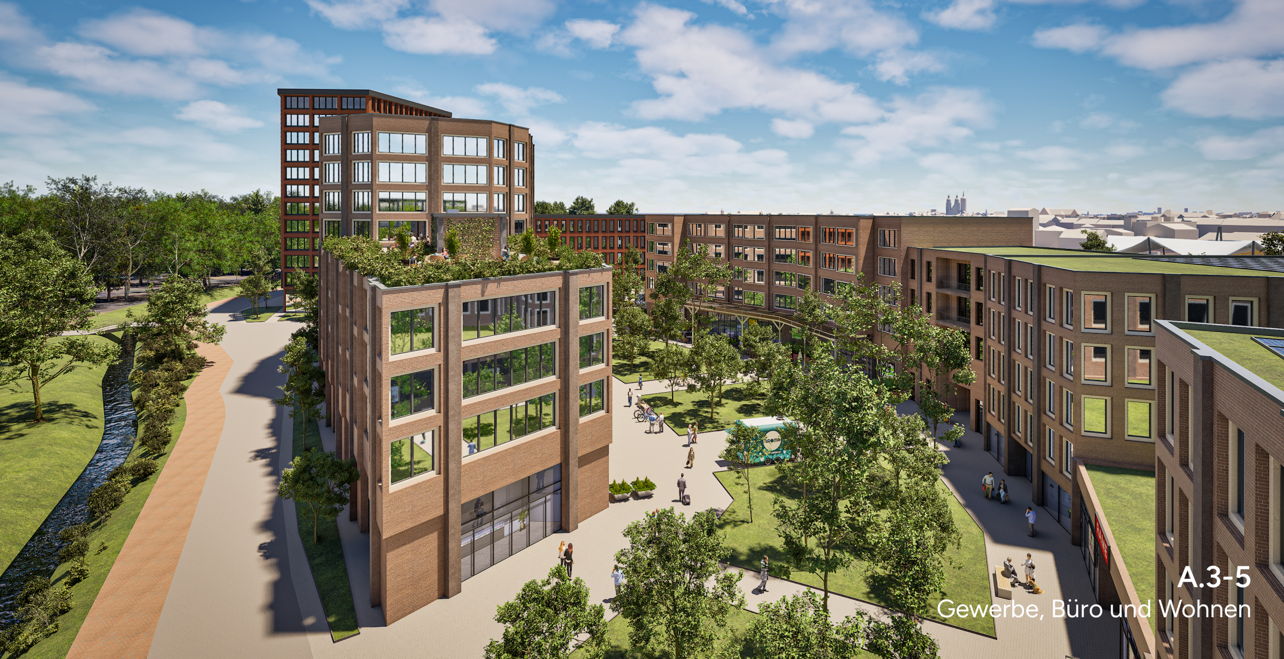 Im Quar­tier selbst ent­steht ein leben­di­ger Ver­sor­gungs­be­reichEin­kaufs­mög­lich­kei­ten für den täg­li­chen Bedarf sind in maxi­mal fünf Geh­mi­nu­ten erreichbar.