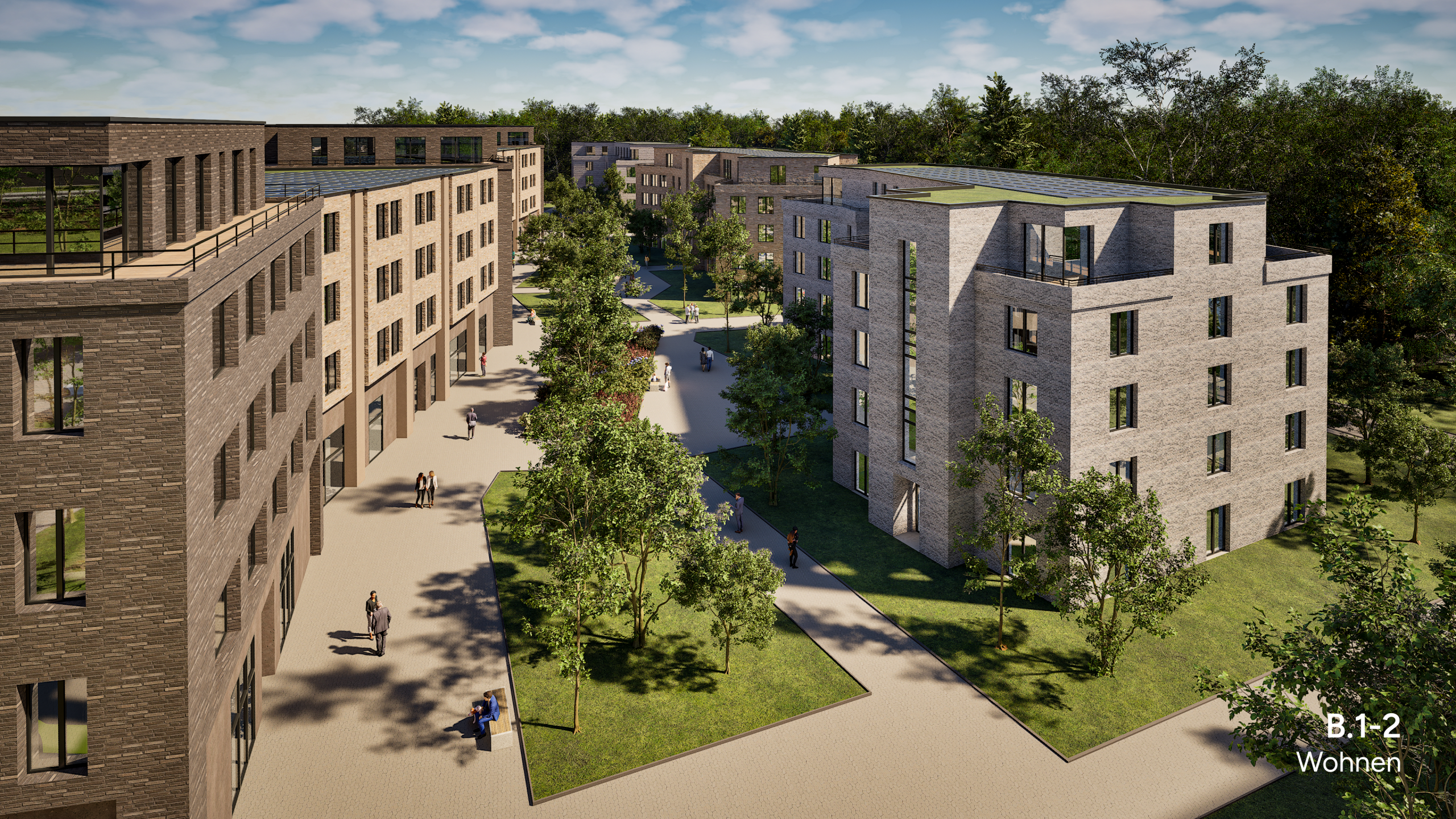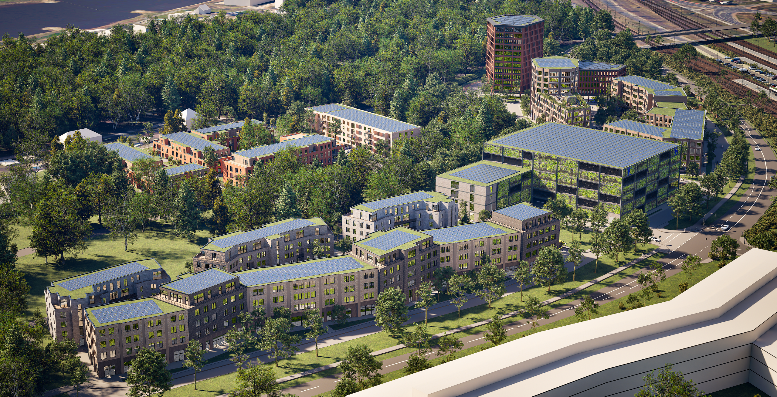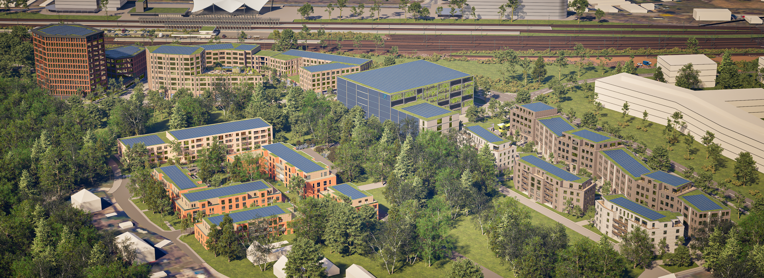 Unmit­tel­bar am Bahn­hof ent­steht das neue urba­ne Quar­tier ‚Spe­cke­bach‘ – ein zukunfts­wei­sen­des Vier­tel, das urba­nen Kom­fort mit Woh­nen im Grü­nen ver­bin­det. Auf dem rund 86.000 m² gro­ßen Gelän­de ent­ste­hen hoch­wer­ti­ge, bezahl­ba­re Woh­nun­gen, die dank modu­la­rer Bau­wei­se und kur­zer Bau­zei­ten schnell bezugs­fer­tig sind – mit mehr Wohn­flä­che und weni­ger Nebenflächen.