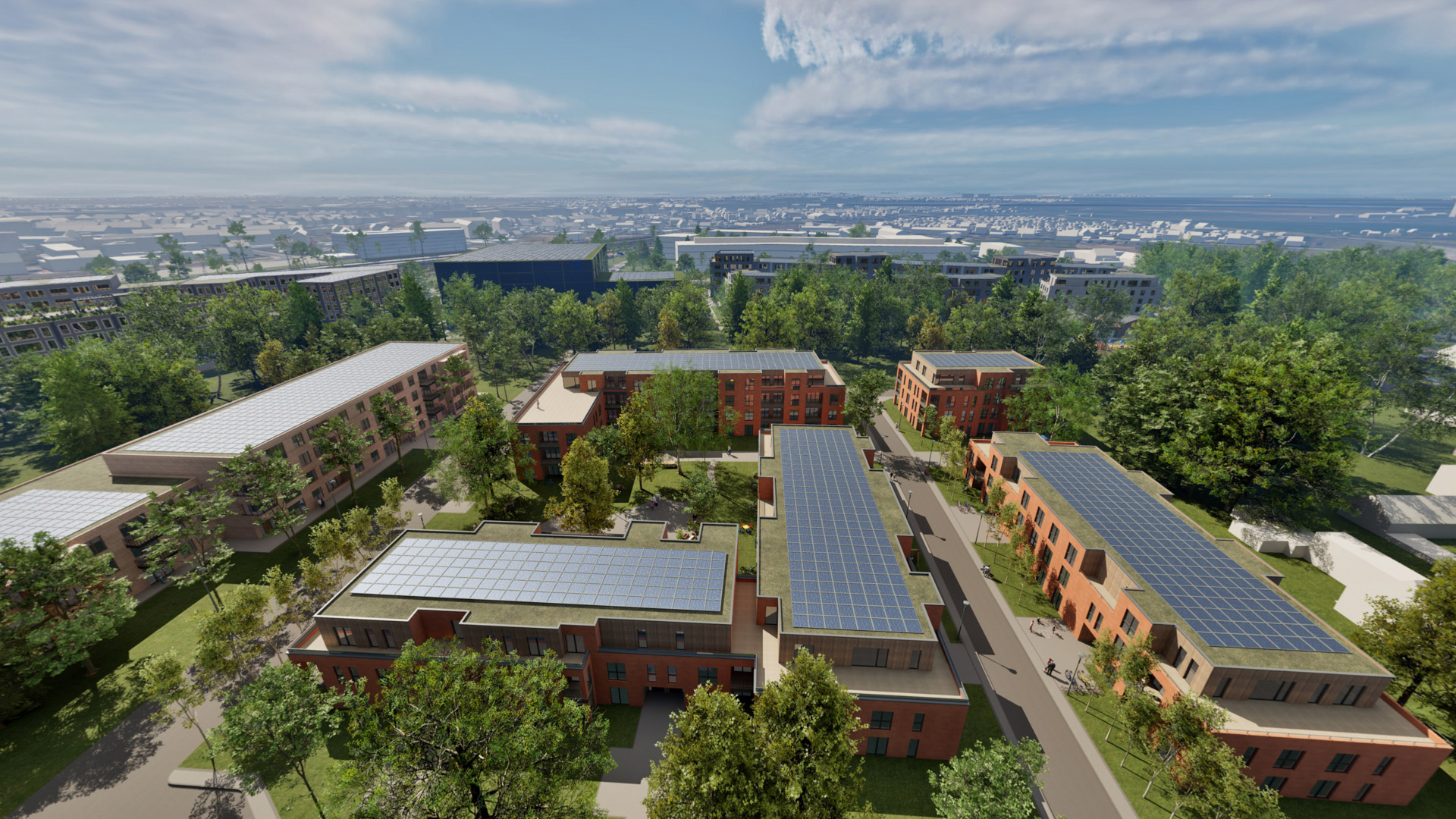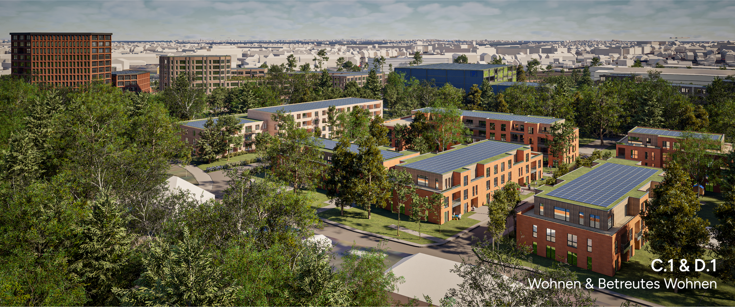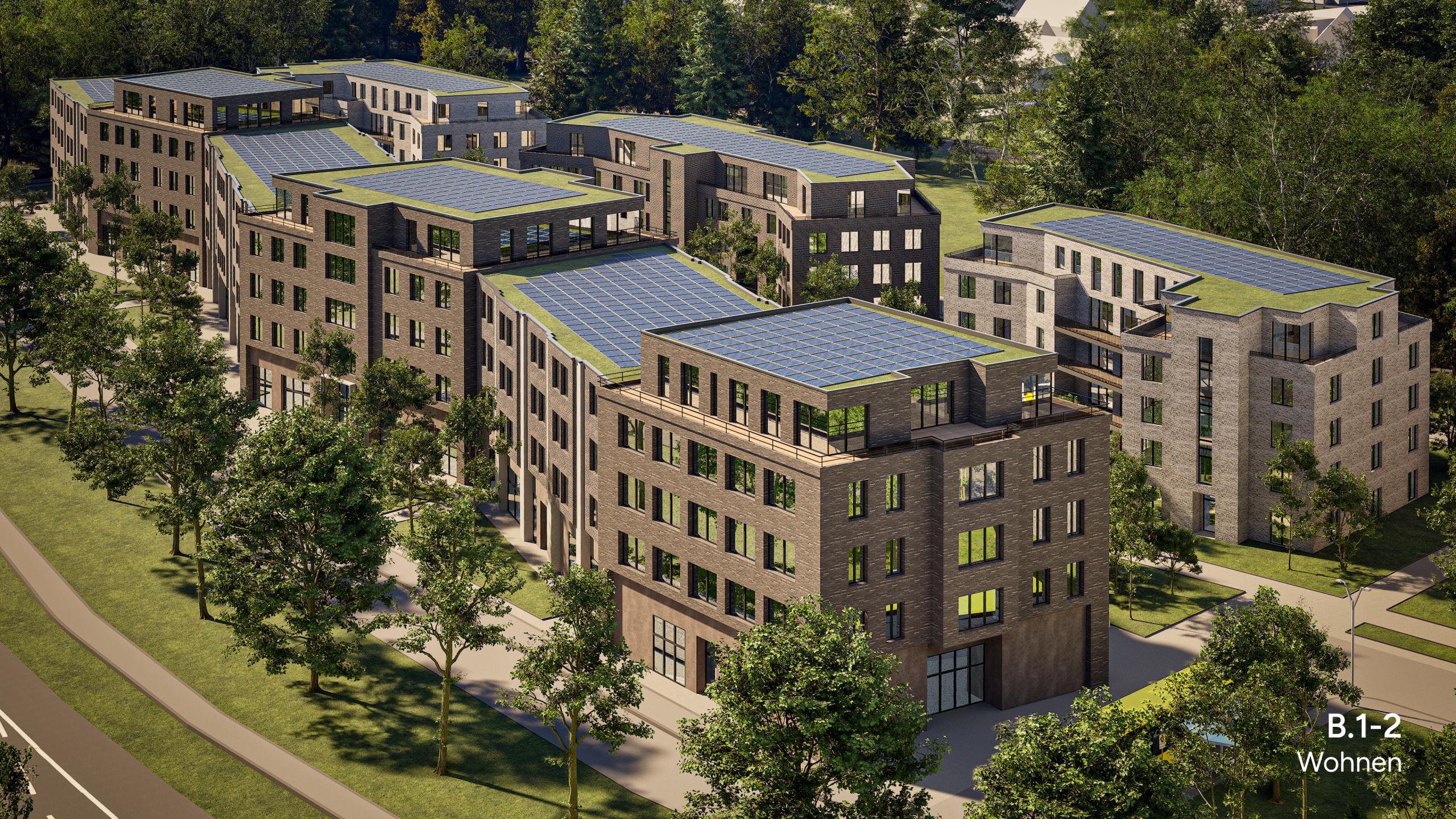 Die kli­ma­neu­tra­le Ener­gie­ver­sor­gung sorgt für sta­bi­le und nied­ri­ge Neben­kos­ten und garan­tiert Kos­ten­si­cher­heit für min­des­tens zehn Jah­re – ganz ohne fos­si­le Roh­stof­fe. Ein moder­nes Mobi­li­täts­kon­zept setzt auf ein auto­ar­mes Quar­tier, brei­te Fuß- und Rad­we­ge sowie Sha­ring-Ange­bo­te wie Car­sha­ring und E‑Bikes direkt vor Ort.