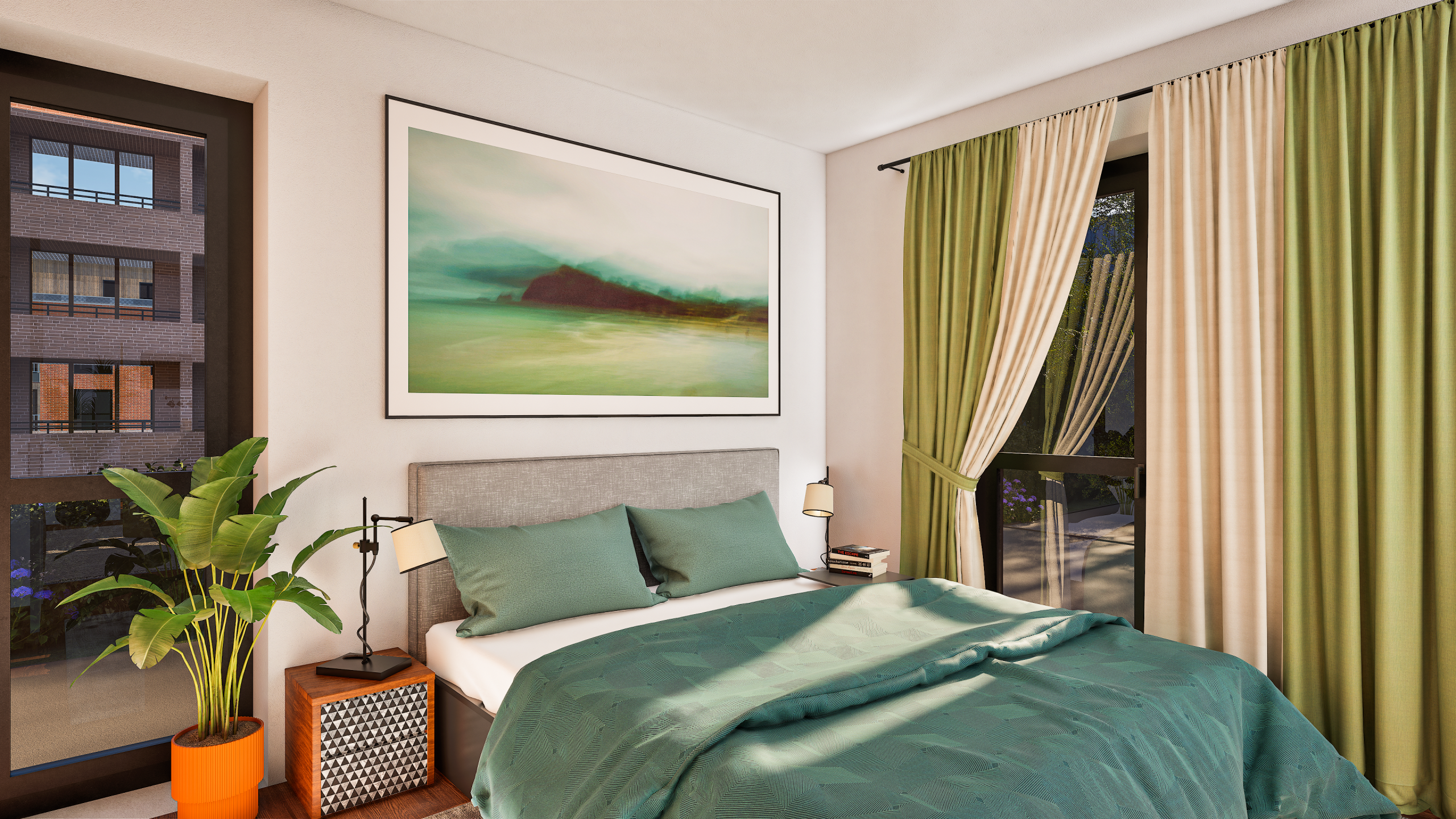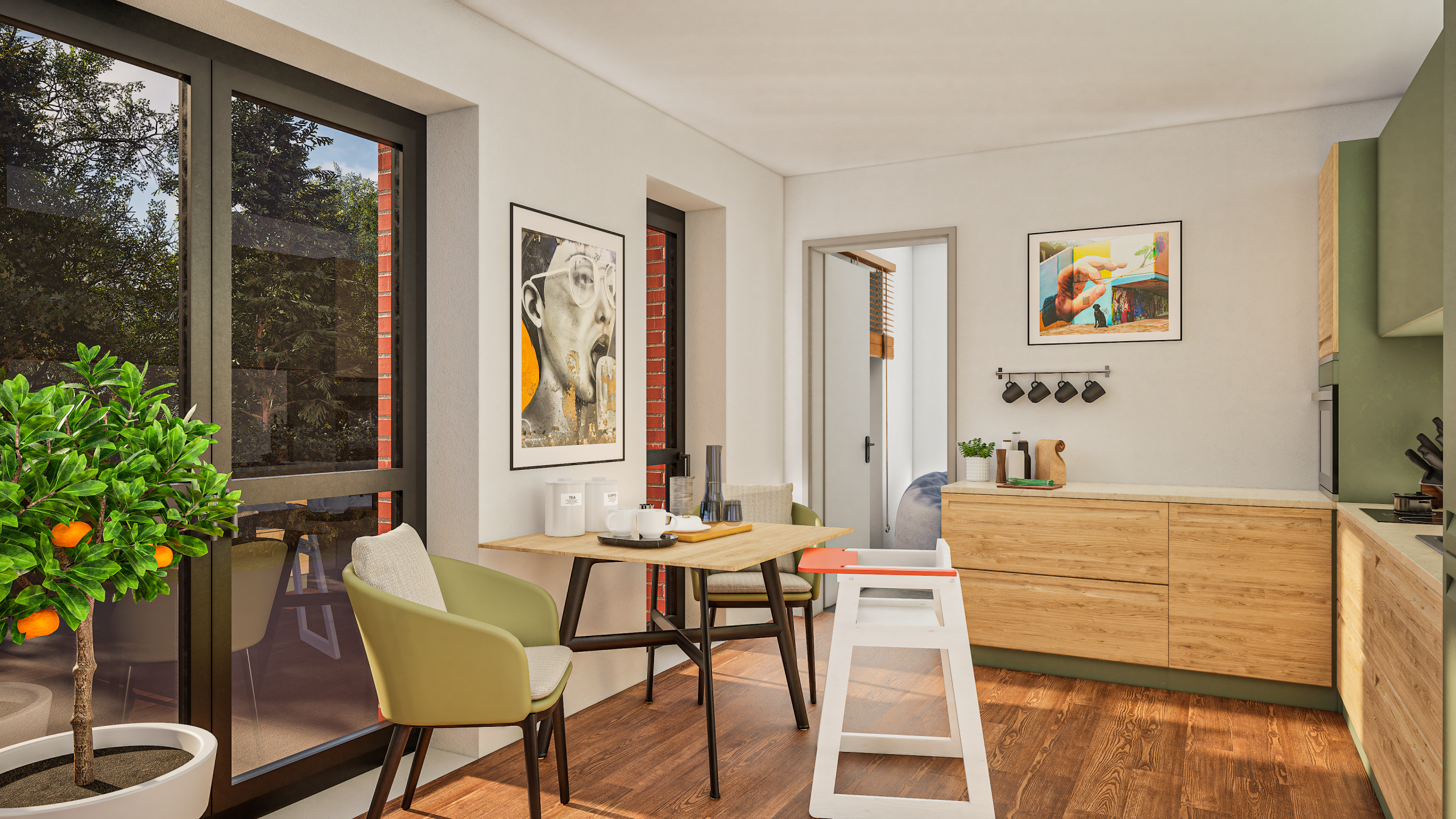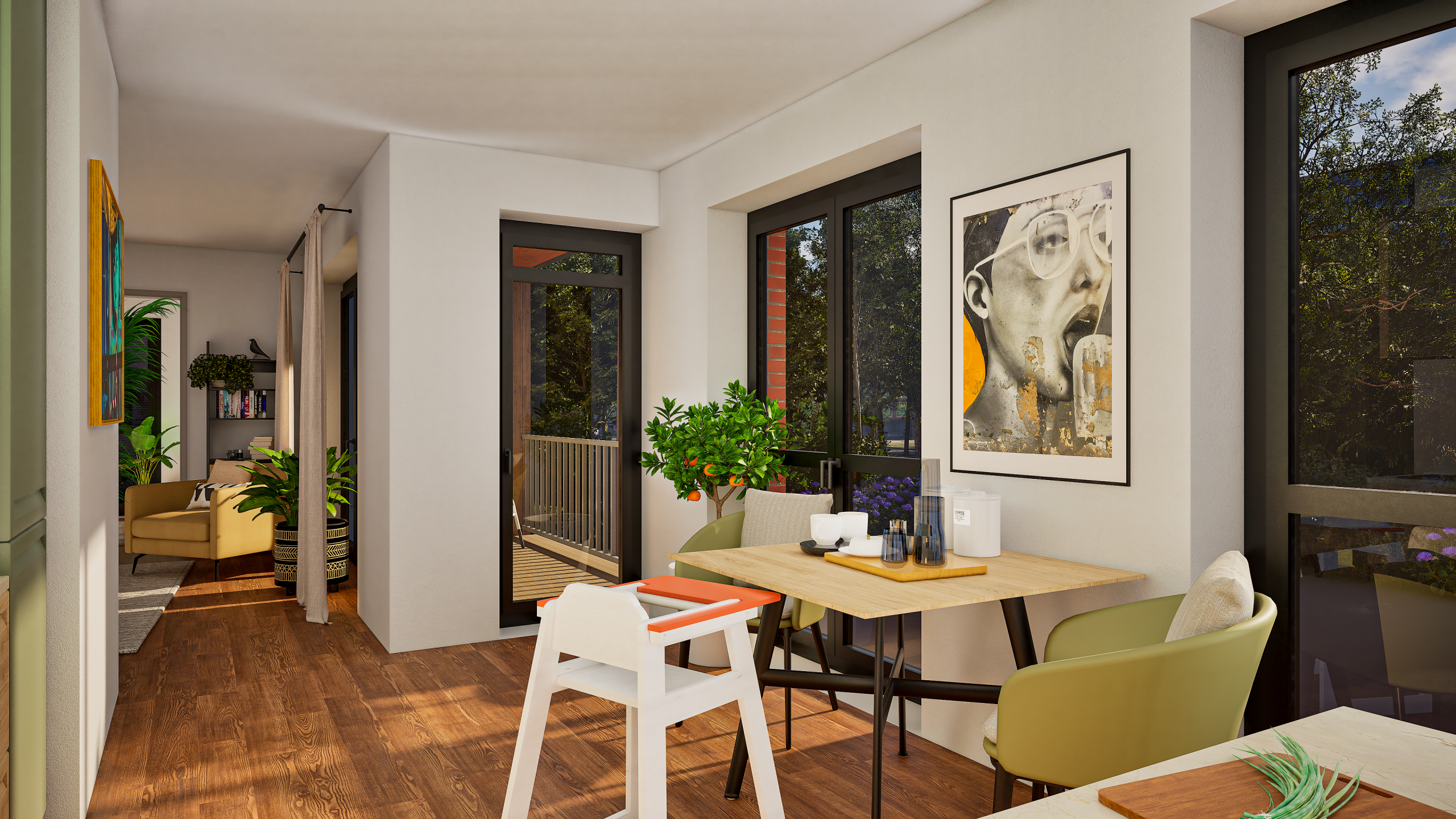 Die kli­ma­neu­tra­le Ener­gie­ver­sor­gung sorgt für sta­bi­le und nied­ri­ge Neben­kos­ten und garan­tiert Kos­ten­si­cher­heit für min­des­tens zehn Jah­re – ganz ohne fos­si­le Roh­stof­fe. Ein moder­nes Mobi­li­täts­kon­zept setzt auf ein auto­ar­mes Quar­tier, brei­te Fuß- und Rad­we­ge sowie Sha­ring-Ange­bo­te wie Car­sha­ring und E‑Bikes direkt vor Ort.